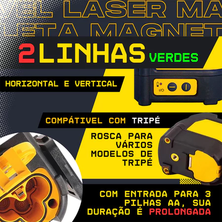 Com suas duas linhas de laser, este modelo permite realizar medições em cruz, facilitando o alinhamento e nivelamento de objetos. Sua precisão de 3 mm garante resultados confiáveis em cada projeto.